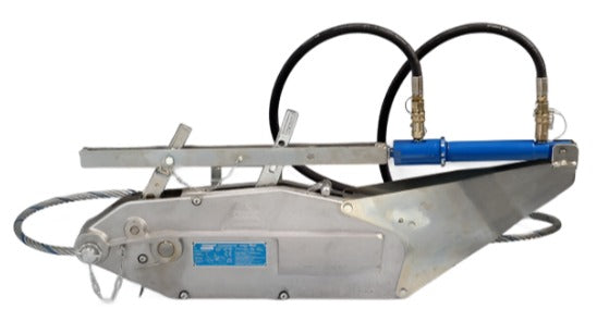 The Habegger manual wire rope hoist HIT-16 can be converted to a hydraulic drive in a straightforward procedure. The direction is changed by shifting the cylinder attachment from the forward to the reverse lever. The hydraulic unit is separate. One or two units can be operated at the same time, depending on the hydraulic drive.