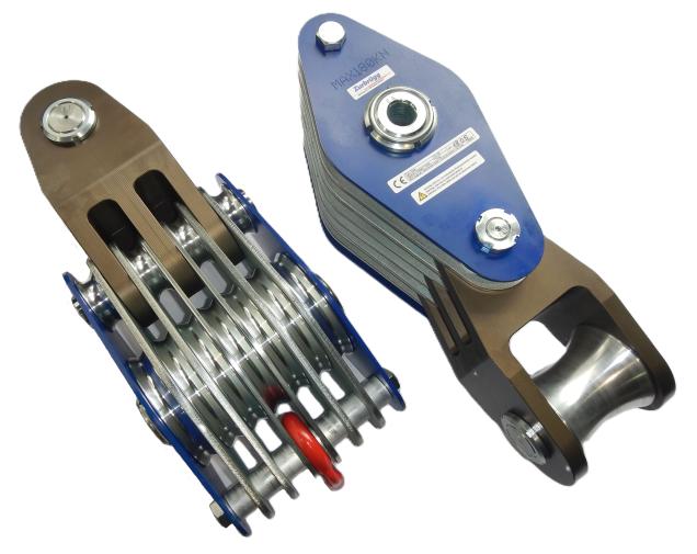Aluminum Pulley Blocks with maximum WLL of 18 tons. Rollers are made of aluminum and fit wire ropes with a maximum diameter of 12 mm.